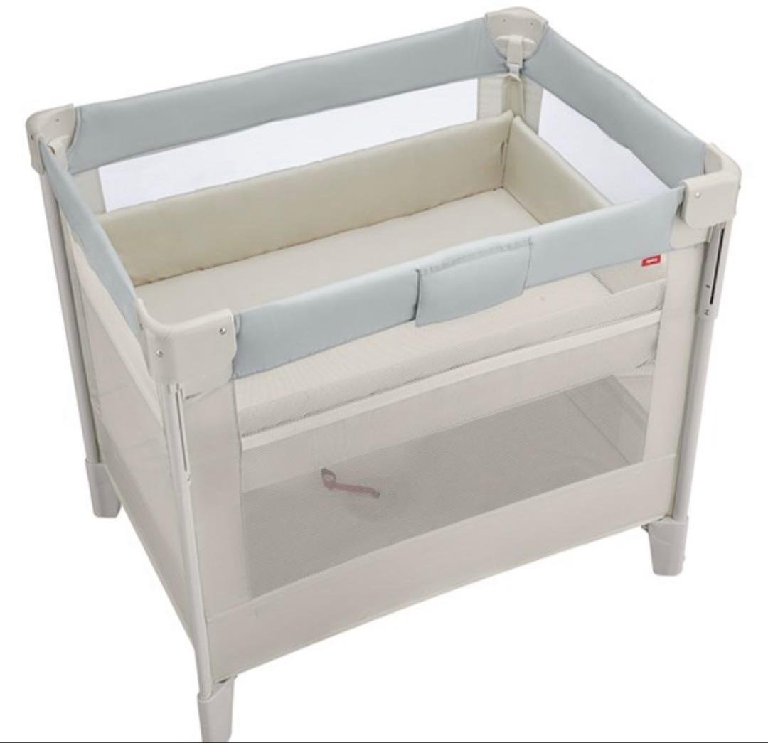 新品購入し、2人の子供に新生児から5ヶ月程まで使用しました。ベビーベッドの枠は使用せず畳んで専用の袋に入れて保管してた為美品です。ベビーサークルとしても使用できます。ベビーベッドの中のベッド部分だけ使用していました。写真7枚目。よく見ると細かな汚れは多少ありますが、よくみないと分からない程です。写真8〜11枚目。夜撮ったので暗く写ってしまってますが、美品です。折りたたんで専用の袋に入れて梱包して発送予定です。ベビーベッドベビーサークルアップルリカココネルエアープラス