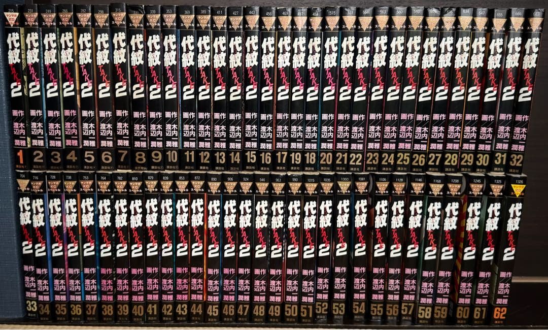 お約束の写真の掲載、遅れてしまい失礼しました。下段の三冊が手前から3、2、1巻上段が右から4巻〜20巻となります。2巻の焼けの状態がかなりあるので、開いた状態の写真も合わせてご確認お願いします。